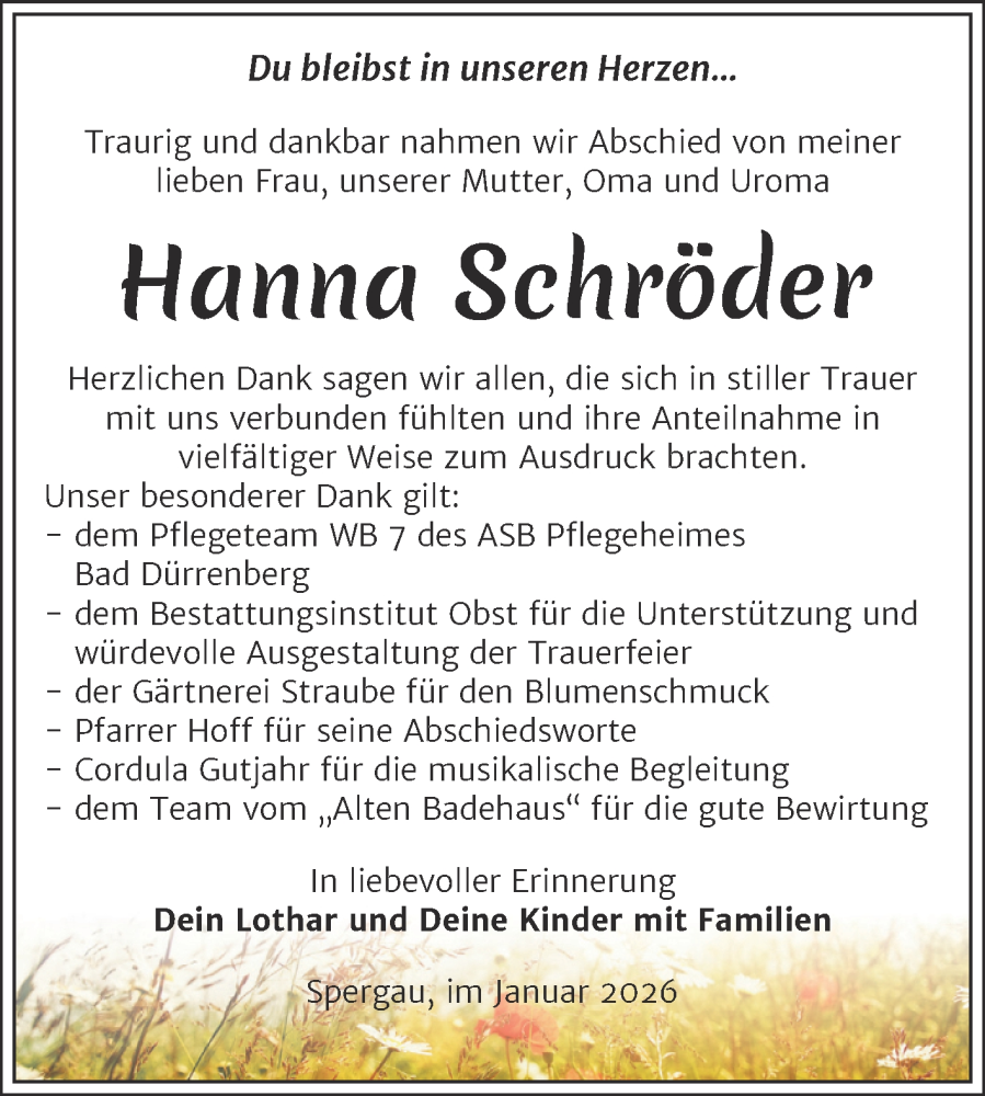 Hier finden Sie alle Traueranzeigen aus der Zeitung, die bisher für Hanna Schröder erschienen sind. Weitere Traueranzeigen, die in der Zeitung erscheinen, werden hier ebenfalls aufgelistet