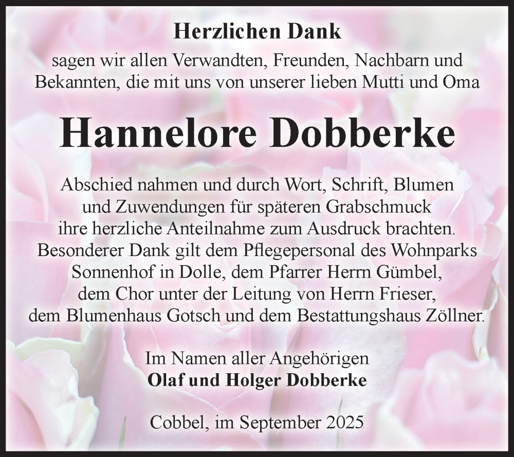 Hier finden Sie alle Traueranzeigen aus der Zeitung, die bisher für Hannelore Dobberke erschienen sind. Weitere Traueranzeigen, die in der Zeitung erscheinen, werden hier ebenfalls aufgelistet
