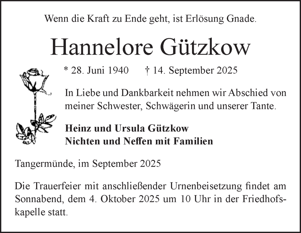 Hier finden Sie alle Traueranzeigen aus der Zeitung, die bisher für Hannelore Gützkow erschienen sind. Weitere Traueranzeigen, die in der Zeitung erscheinen, werden hier ebenfalls aufgelistet