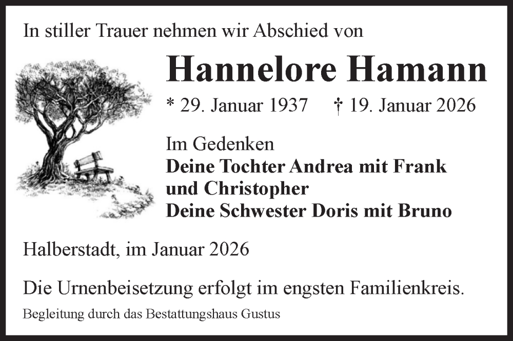Hier finden Sie alle Traueranzeigen aus der Zeitung, die bisher für Hannelore Hamann erschienen sind. Weitere Traueranzeigen, die in der Zeitung erscheinen, werden hier ebenfalls aufgelistet