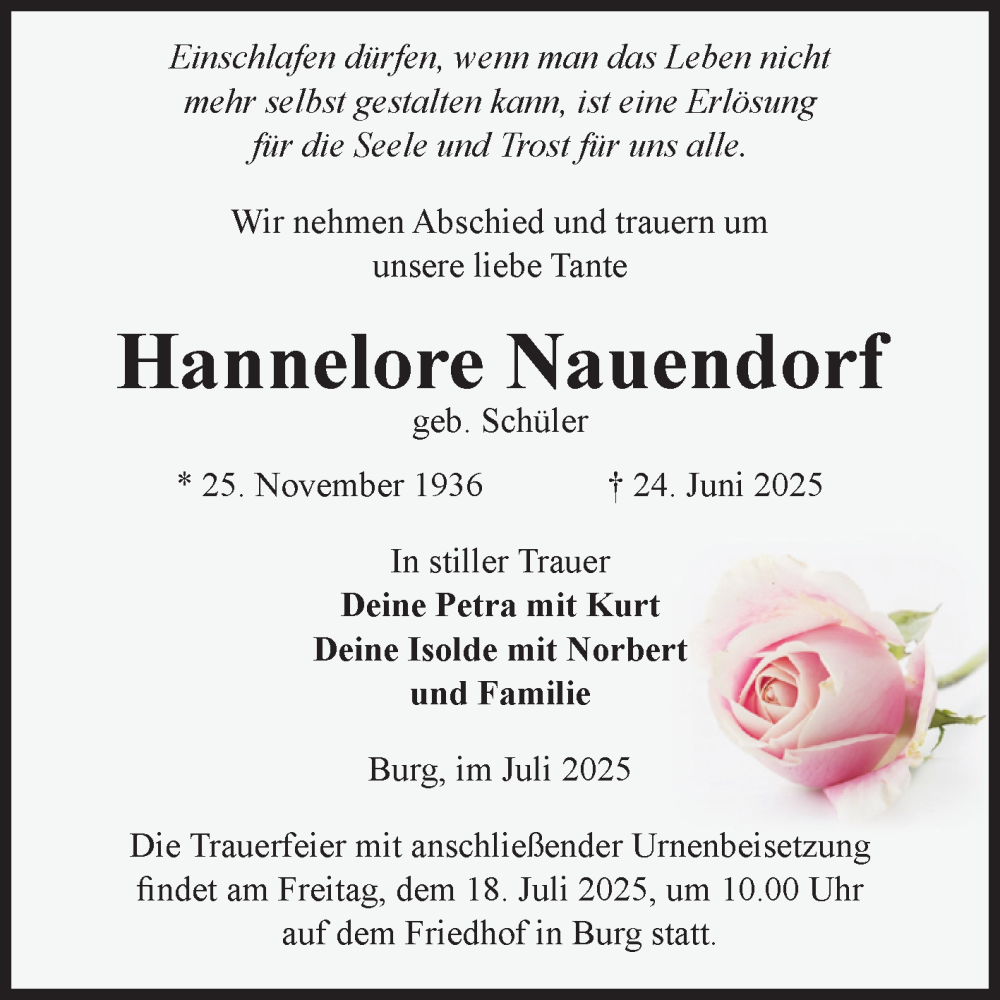 Hier finden Sie alle Traueranzeigen aus der Zeitung, die bisher für Hannelore Nauendorf erschienen sind. Weitere Traueranzeigen, die in der Zeitung erscheinen, werden hier ebenfalls aufgelistet