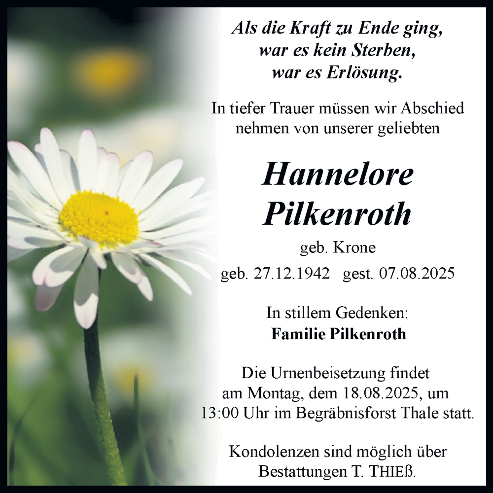 Hier finden Sie alle Traueranzeigen aus der Zeitung, die bisher für Hannelore Pilkenroth erschienen sind. Weitere Traueranzeigen, die in der Zeitung erscheinen, werden hier ebenfalls aufgelistet