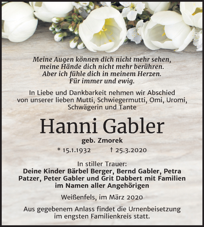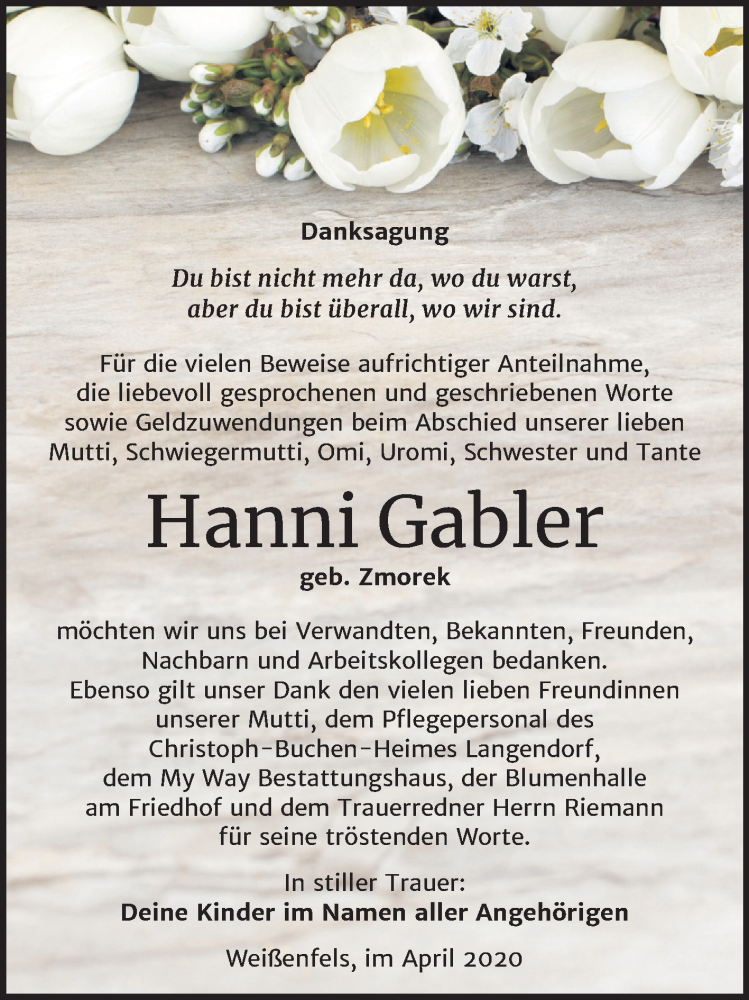 Hier finden Sie alle Traueranzeigen aus der Zeitung, die bisher für Hanni Gabler erschienen sind. Weitere Traueranzeigen, die in der Zeitung erscheinen, werden hier ebenfalls aufgelistet