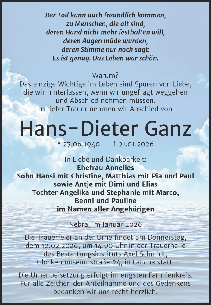 Hier finden Sie alle Traueranzeigen aus der Zeitung, die bisher für Hans-Dieter Ganz erschienen sind. Weitere Traueranzeigen, die in der Zeitung erscheinen, werden hier ebenfalls aufgelistet