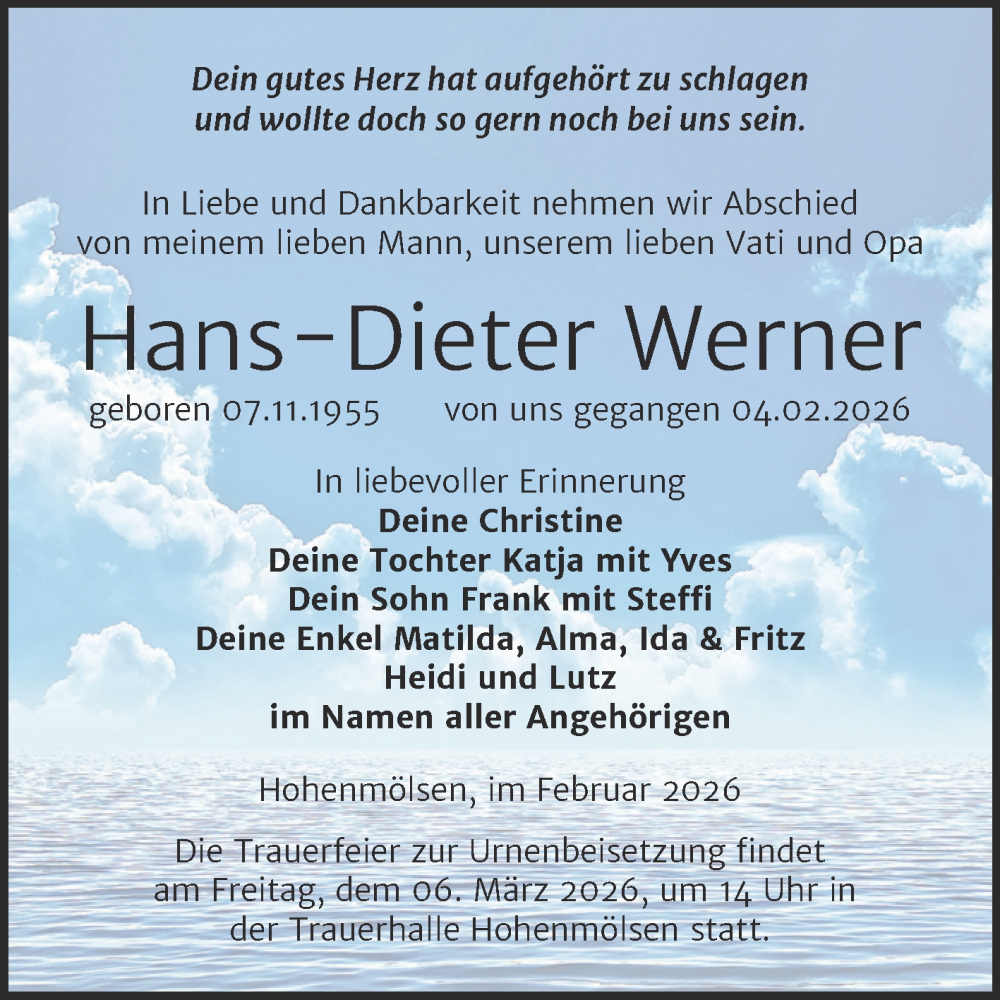 Hier finden Sie alle Traueranzeigen aus der Zeitung, die bisher für Hans-Dieter Werner erschienen sind. Weitere Traueranzeigen, die in der Zeitung erscheinen, werden hier ebenfalls aufgelistet