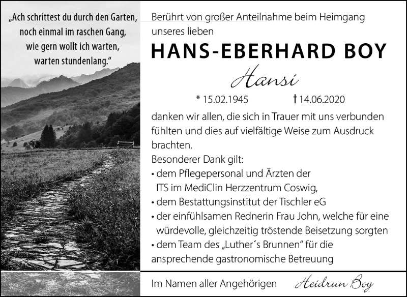 Hier finden Sie alle Traueranzeigen aus der Zeitung, die bisher für Hans-Eberhard Boy erschienen sind. Weitere Traueranzeigen, die in der Zeitung erscheinen, werden hier ebenfalls aufgelistet