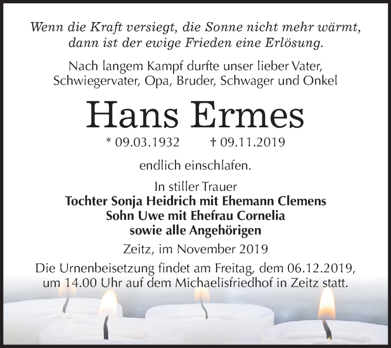 Hier finden Sie alle Traueranzeigen aus der Zeitung, die bisher für Hans Ermes erschienen sind. Weitere Traueranzeigen, die in der Zeitung erscheinen, werden hier ebenfalls aufgelistet