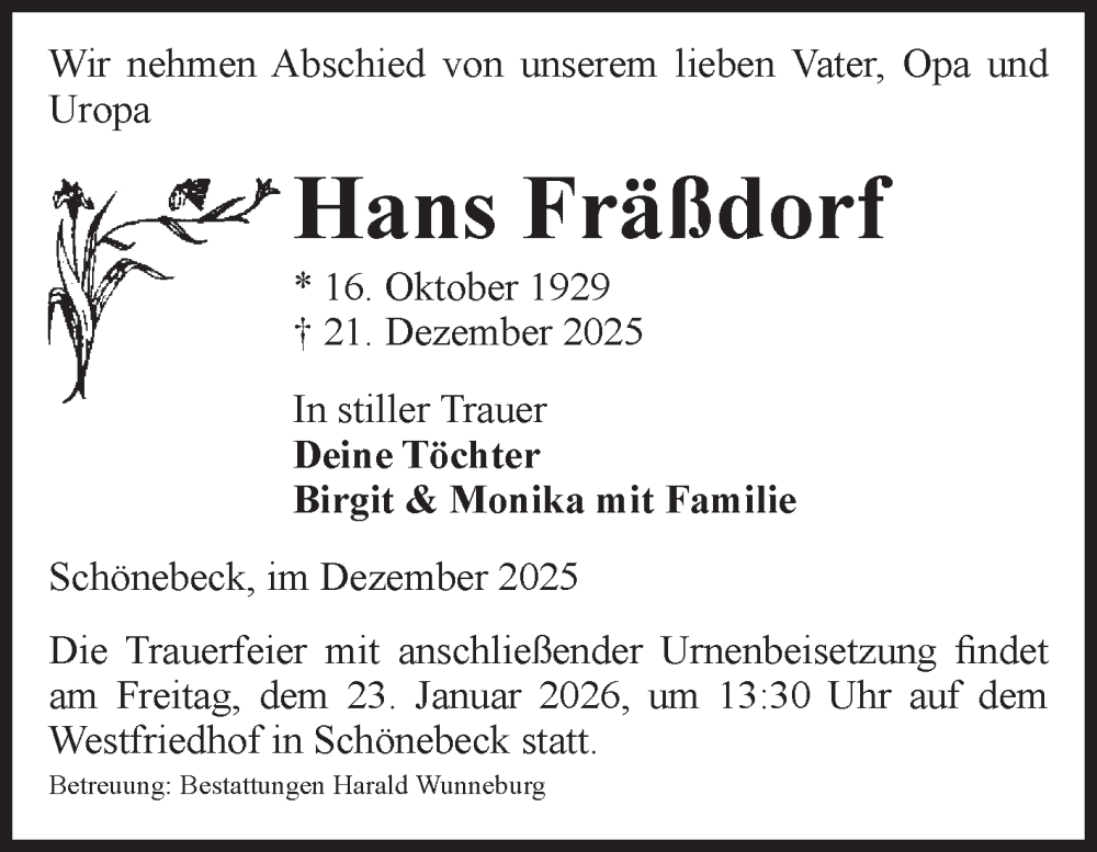 Hier finden Sie alle Traueranzeigen aus der Zeitung, die bisher für Hans Fräßdorf erschienen sind. Weitere Traueranzeigen, die in der Zeitung erscheinen, werden hier ebenfalls aufgelistet