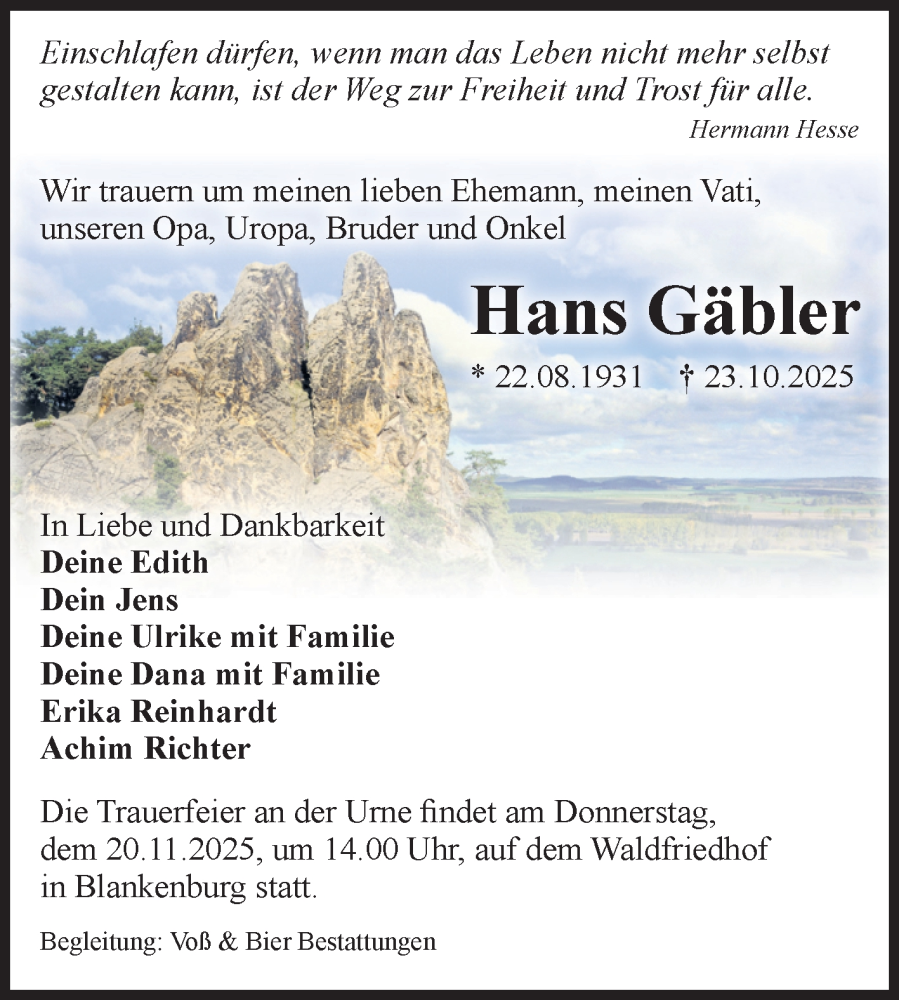 Hier finden Sie alle Traueranzeigen aus der Zeitung, die bisher für Hans Gäbler erschienen sind. Weitere Traueranzeigen, die in der Zeitung erscheinen, werden hier ebenfalls aufgelistet