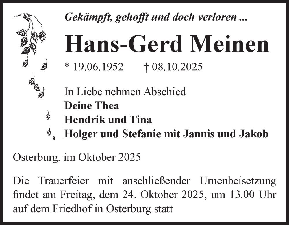 Hier finden Sie alle Traueranzeigen aus der Zeitung, die bisher für Hans-Gerd Meinen erschienen sind. Weitere Traueranzeigen, die in der Zeitung erscheinen, werden hier ebenfalls aufgelistet
