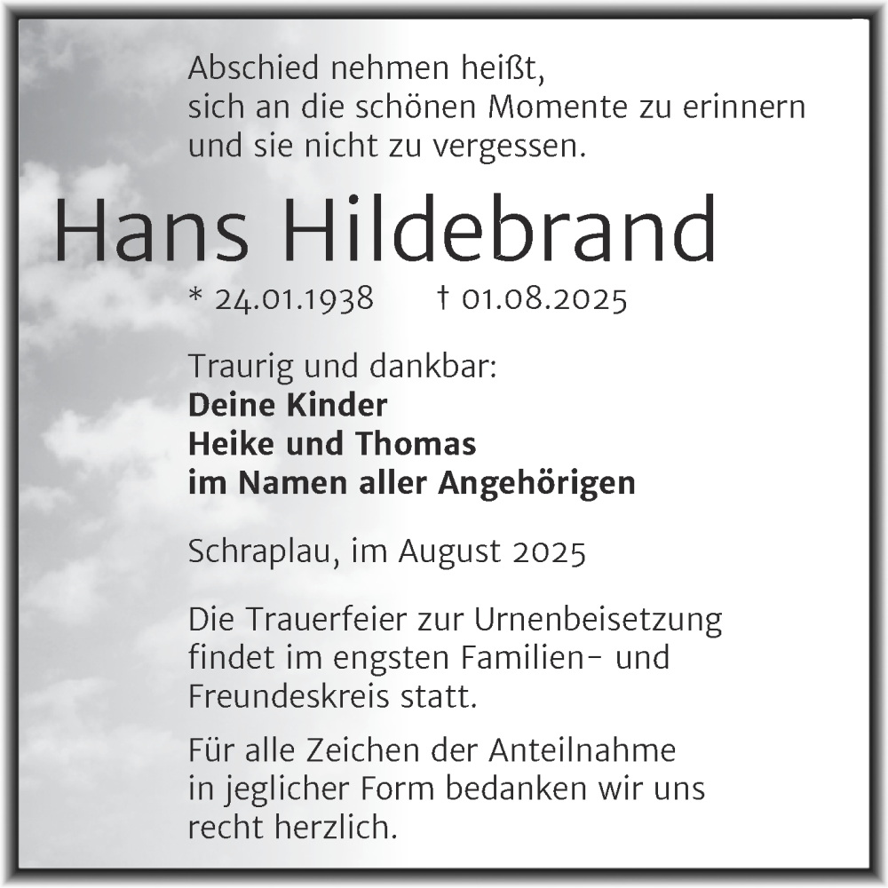 Hier finden Sie alle Traueranzeigen aus der Zeitung, die bisher für Hans Hildebrand erschienen sind. Weitere Traueranzeigen, die in der Zeitung erscheinen, werden hier ebenfalls aufgelistet