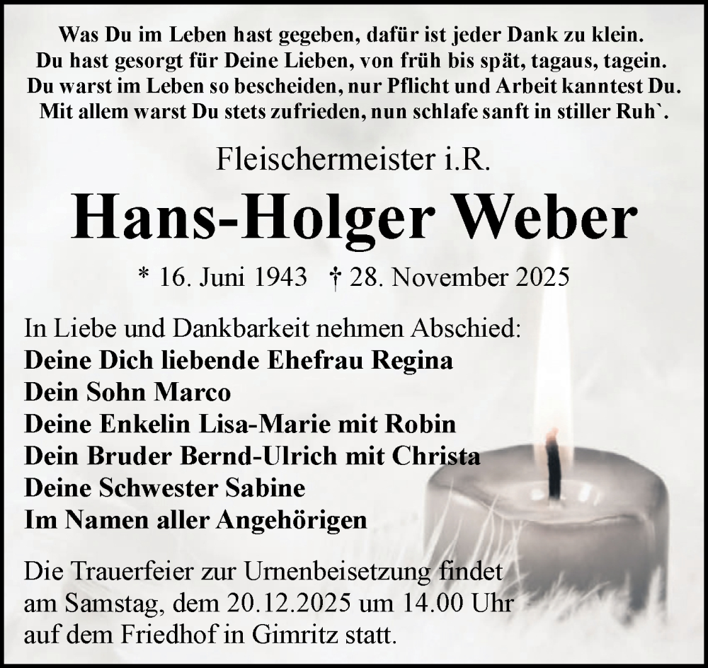 Hier finden Sie alle Traueranzeigen aus der Zeitung, die bisher für Hans-Holger Weber erschienen sind. Weitere Traueranzeigen, die in der Zeitung erscheinen, werden hier ebenfalls aufgelistet
