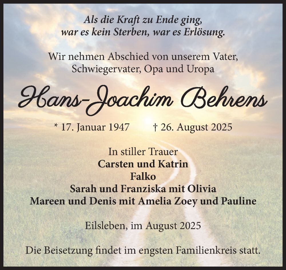 Hier finden Sie alle Traueranzeigen aus der Zeitung, die bisher für Hans-Joachim Behrens erschienen sind. Weitere Traueranzeigen, die in der Zeitung erscheinen, werden hier ebenfalls aufgelistet