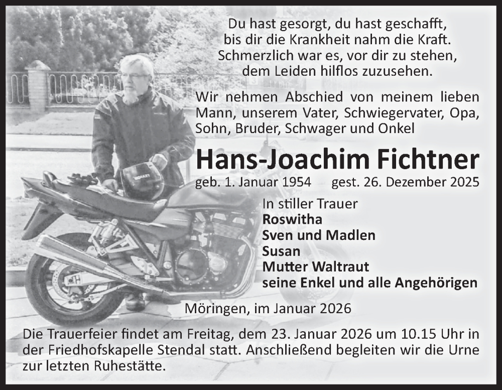 Hier finden Sie alle Traueranzeigen aus der Zeitung, die bisher für Hans-Joachim Fichtner erschienen sind. Weitere Traueranzeigen, die in der Zeitung erscheinen, werden hier ebenfalls aufgelistet