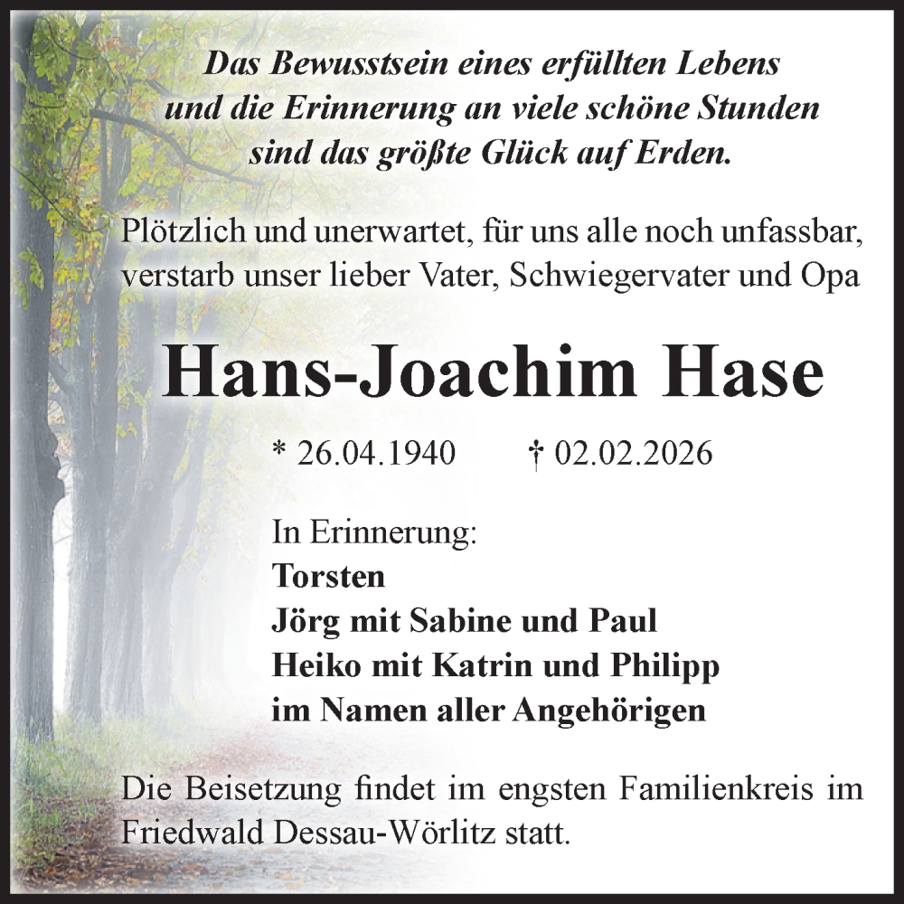 Hier finden Sie alle Traueranzeigen aus der Zeitung, die bisher für Hans-Joachim Hase erschienen sind. Weitere Traueranzeigen, die in der Zeitung erscheinen, werden hier ebenfalls aufgelistet