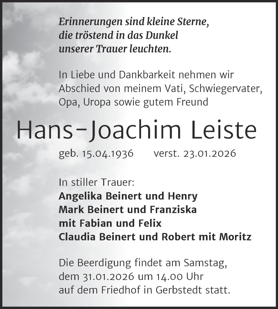 Hier finden Sie alle Traueranzeigen aus der Zeitung, die bisher für Hans-Joachim Leiste erschienen sind. Weitere Traueranzeigen, die in der Zeitung erscheinen, werden hier ebenfalls aufgelistet