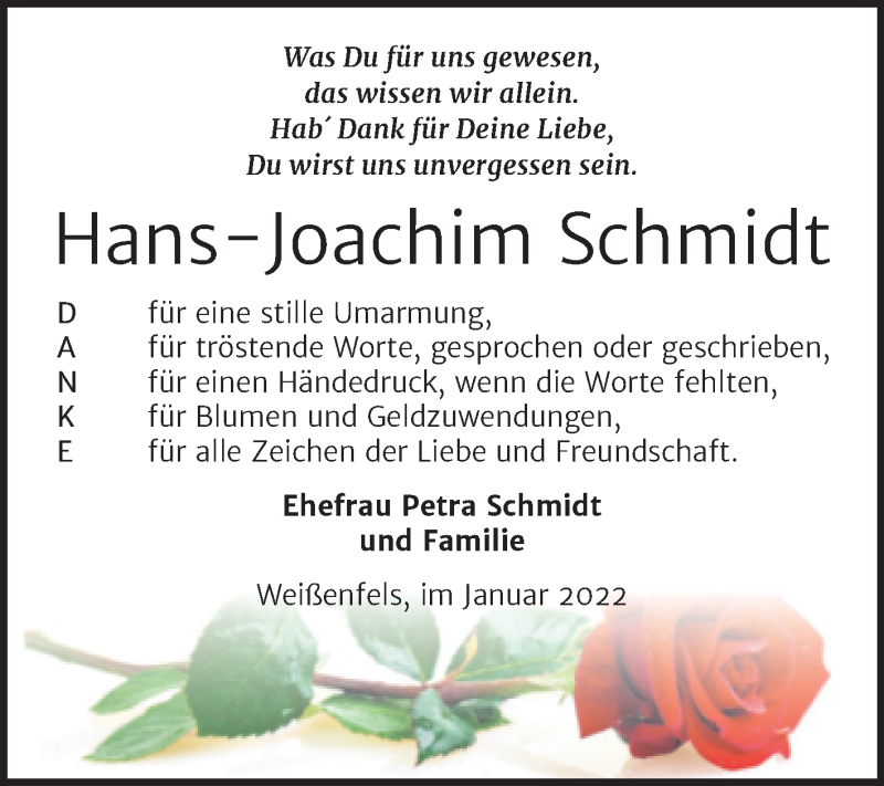 Hier finden Sie alle Traueranzeigen aus der Zeitung, die bisher für Hans-Joachim Schmidt erschienen sind. Weitere Traueranzeigen, die in der Zeitung erscheinen, werden hier ebenfalls aufgelistet