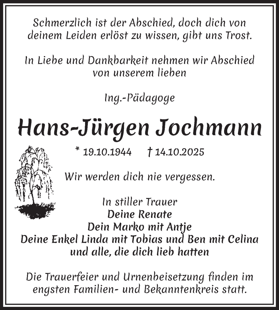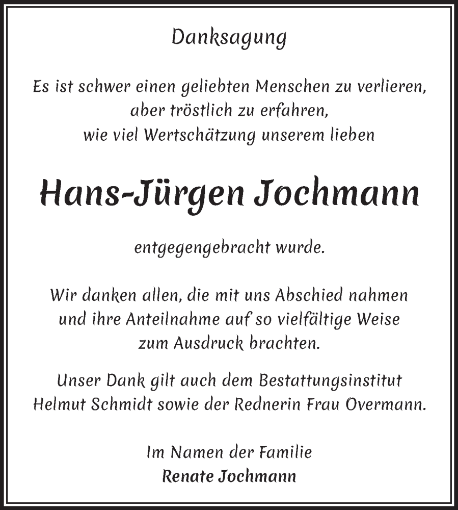 Hier finden Sie alle Traueranzeigen aus der Zeitung, die bisher für Hans-Jürgen Jochmann erschienen sind. Weitere Traueranzeigen, die in der Zeitung erscheinen, werden hier ebenfalls aufgelistet
