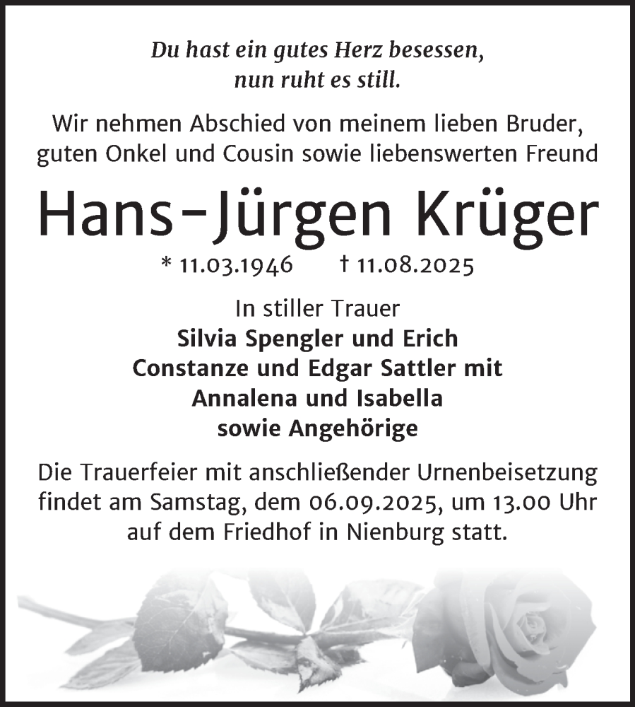 Hier finden Sie alle Traueranzeigen aus der Zeitung, die bisher für Hans-Jürgen Krüger erschienen sind. Weitere Traueranzeigen, die in der Zeitung erscheinen, werden hier ebenfalls aufgelistet