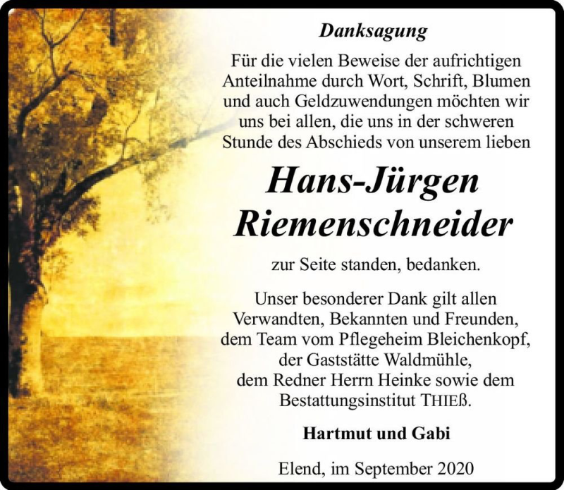 Hier finden Sie alle Traueranzeigen aus der Zeitung, die bisher für Hans-Jürgen Riemenschneider erschienen sind. Weitere Traueranzeigen, die in der Zeitung erscheinen, werden hier ebenfalls aufgelistet