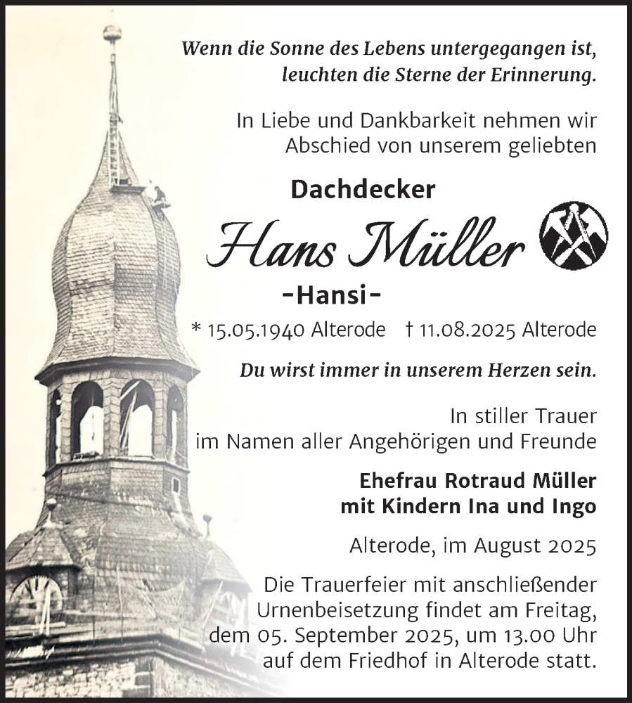 Hier finden Sie alle Traueranzeigen aus der Zeitung, die bisher für Hans Müller erschienen sind. Weitere Traueranzeigen, die in der Zeitung erscheinen, werden hier ebenfalls aufgelistet