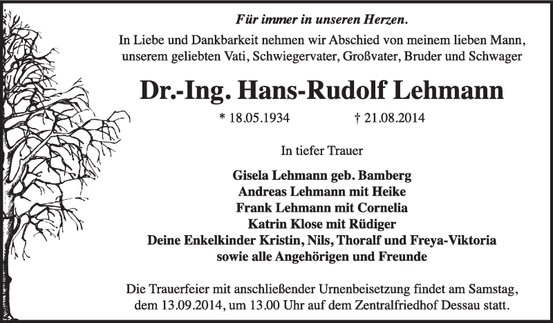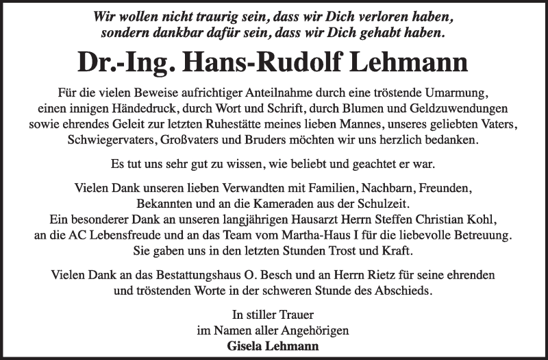 Hier finden Sie alle Traueranzeigen aus der Zeitung, die bisher für Hans-Rudolf Lehmann erschienen sind. Weitere Traueranzeigen, die in der Zeitung erscheinen, werden hier ebenfalls aufgelistet