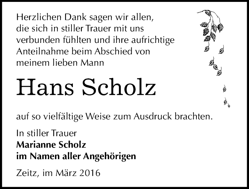 Hier finden Sie alle Traueranzeigen aus der Zeitung, die bisher für Hans Scholz erschienen sind. Weitere Traueranzeigen, die in der Zeitung erscheinen, werden hier ebenfalls aufgelistet