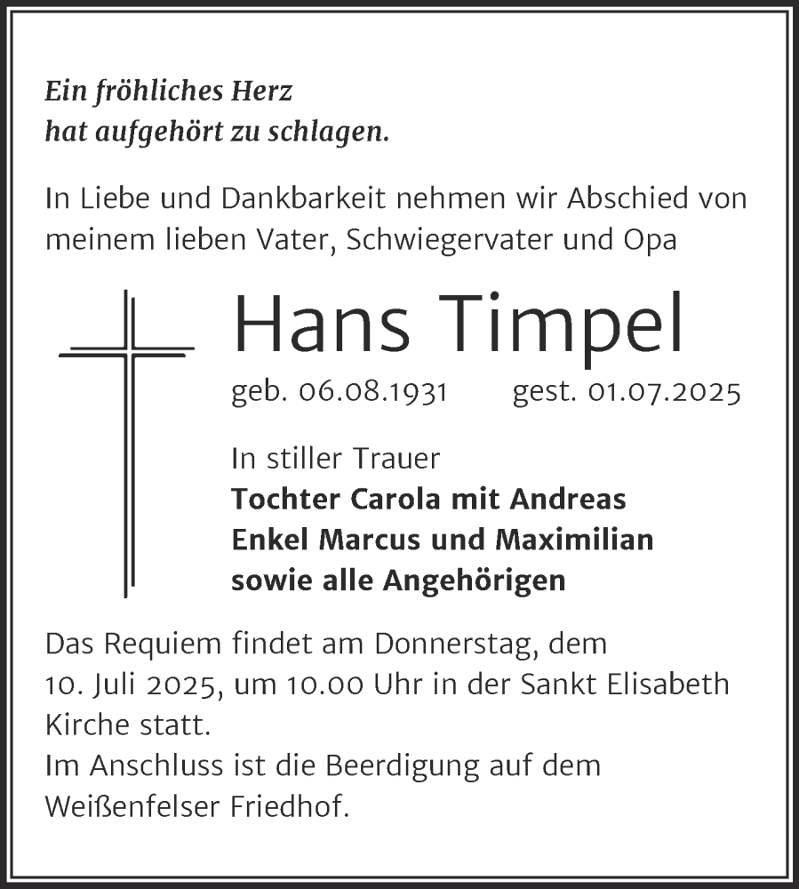 Hier finden Sie alle Traueranzeigen aus der Zeitung, die bisher für Hans Timpel erschienen sind. Weitere Traueranzeigen, die in der Zeitung erscheinen, werden hier ebenfalls aufgelistet