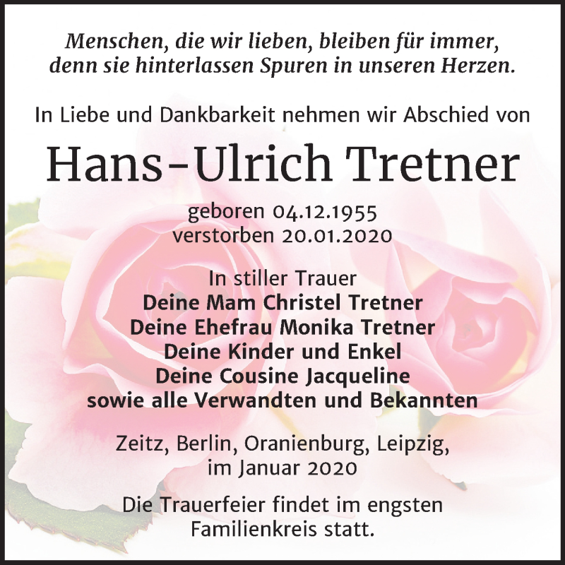 Hier finden Sie alle Traueranzeigen aus der Zeitung, die bisher für Hans-Ulrich Tretner erschienen sind. Weitere Traueranzeigen, die in der Zeitung erscheinen, werden hier ebenfalls aufgelistet