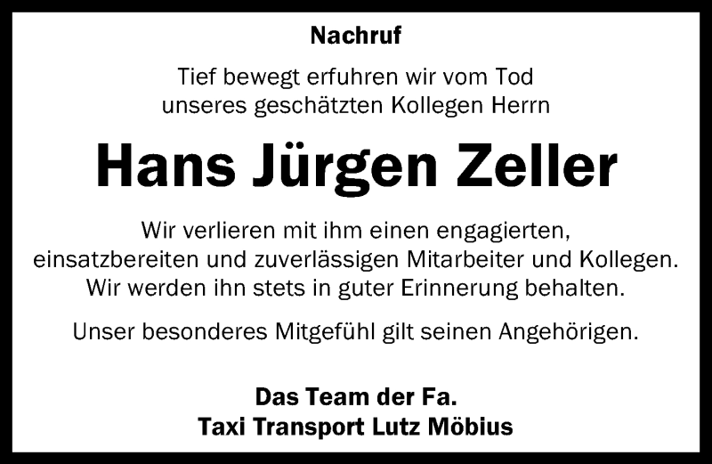 Hier finden Sie alle Traueranzeigen aus der Zeitung, die bisher für Hans Jürgen Zeller erschienen sind. Weitere Traueranzeigen, die in der Zeitung erscheinen, werden hier ebenfalls aufgelistet