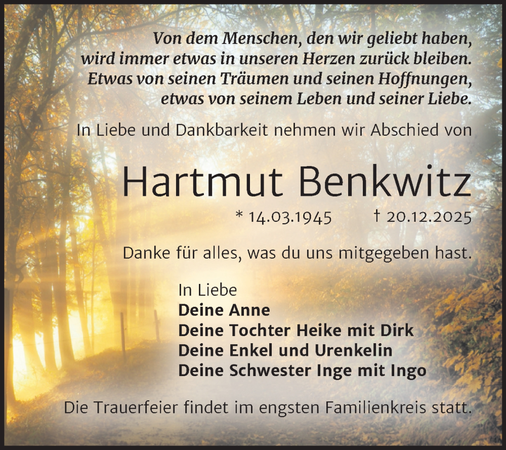 Hier finden Sie alle Traueranzeigen aus der Zeitung, die bisher für Hartmut Benkwitz erschienen sind. Weitere Traueranzeigen, die in der Zeitung erscheinen, werden hier ebenfalls aufgelistet