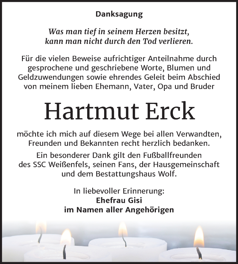 Hier finden Sie alle Traueranzeigen aus der Zeitung, die bisher für Hartmut Erck erschienen sind. Weitere Traueranzeigen, die in der Zeitung erscheinen, werden hier ebenfalls aufgelistet