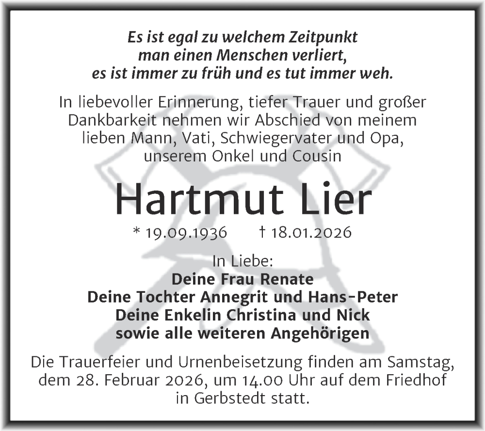 Hier finden Sie alle Traueranzeigen aus der Zeitung, die bisher für Hartmut Lier erschienen sind. Weitere Traueranzeigen, die in der Zeitung erscheinen, werden hier ebenfalls aufgelistet
