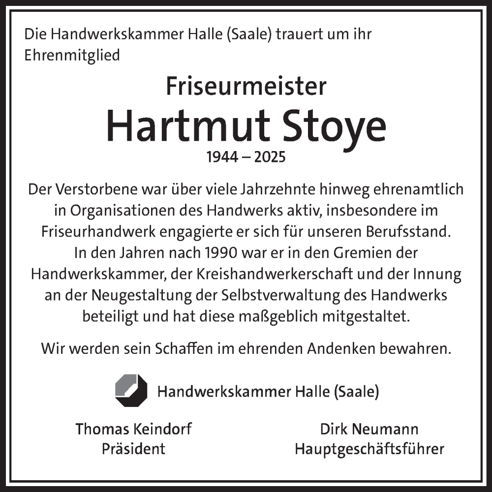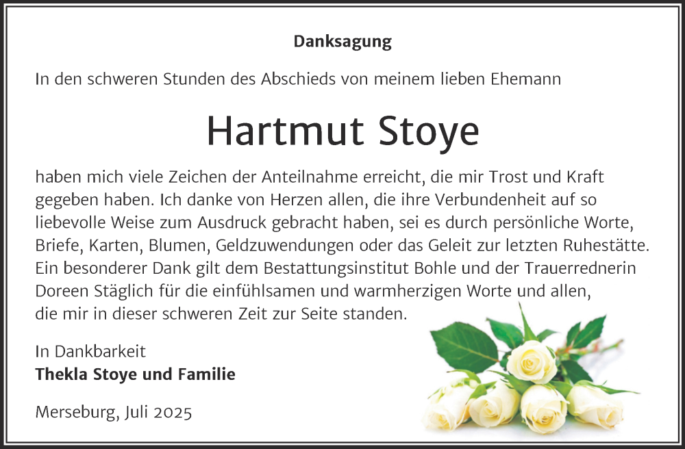 Hier finden Sie alle Traueranzeigen aus der Zeitung, die bisher für Hartmut Stoye erschienen sind. Weitere Traueranzeigen, die in der Zeitung erscheinen, werden hier ebenfalls aufgelistet