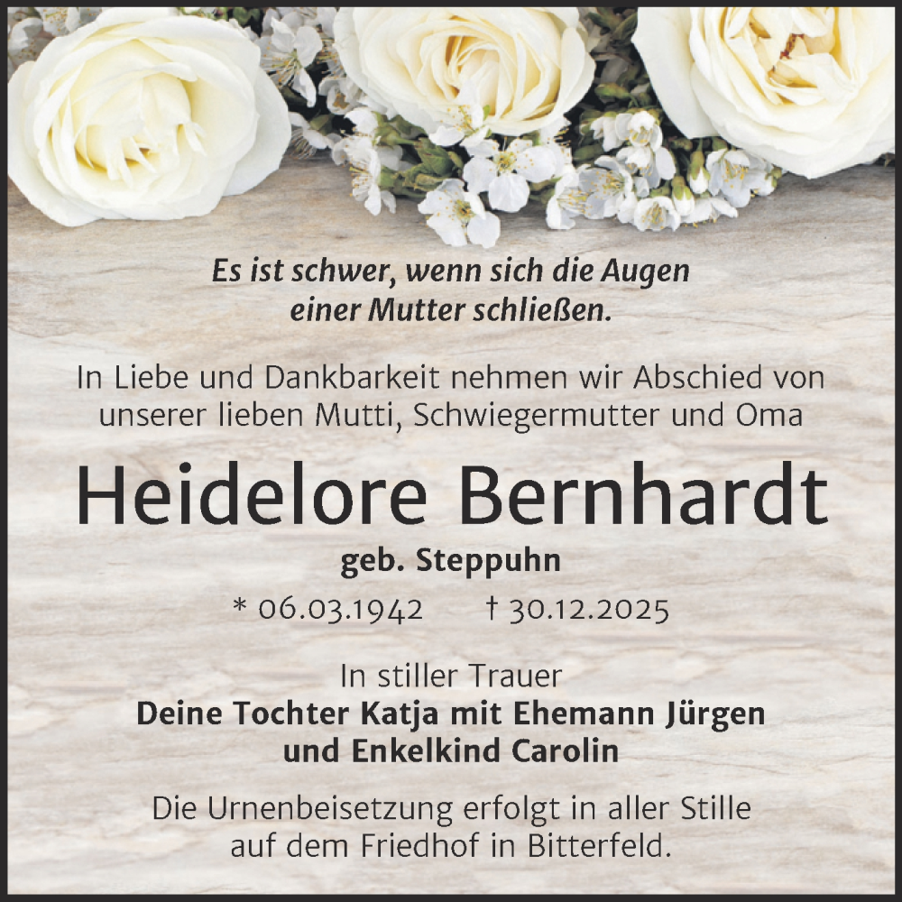 Hier finden Sie alle Traueranzeigen aus der Zeitung, die bisher für Heidelore Bernhardt erschienen sind. Weitere Traueranzeigen, die in der Zeitung erscheinen, werden hier ebenfalls aufgelistet