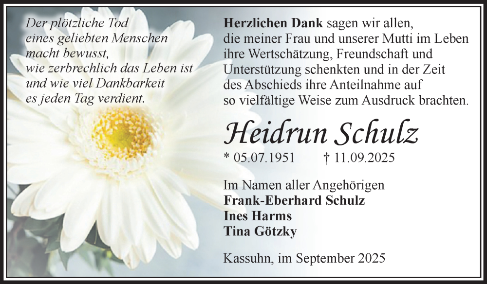 Hier finden Sie alle Traueranzeigen aus der Zeitung, die bisher für Heidrun Schulz erschienen sind. Weitere Traueranzeigen, die in der Zeitung erscheinen, werden hier ebenfalls aufgelistet