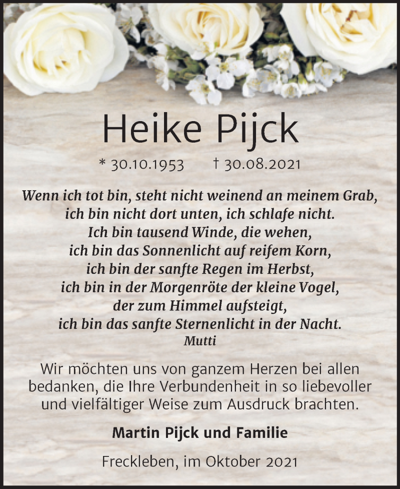 Hier finden Sie alle Traueranzeigen aus der Zeitung, die bisher für Heike Pijck erschienen sind. Weitere Traueranzeigen, die in der Zeitung erscheinen, werden hier ebenfalls aufgelistet