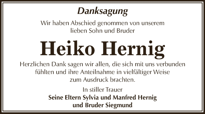 Hier finden Sie alle Traueranzeigen aus der Zeitung, die bisher für Heiko Hernig erschienen sind. Weitere Traueranzeigen, die in der Zeitung erscheinen, werden hier ebenfalls aufgelistet