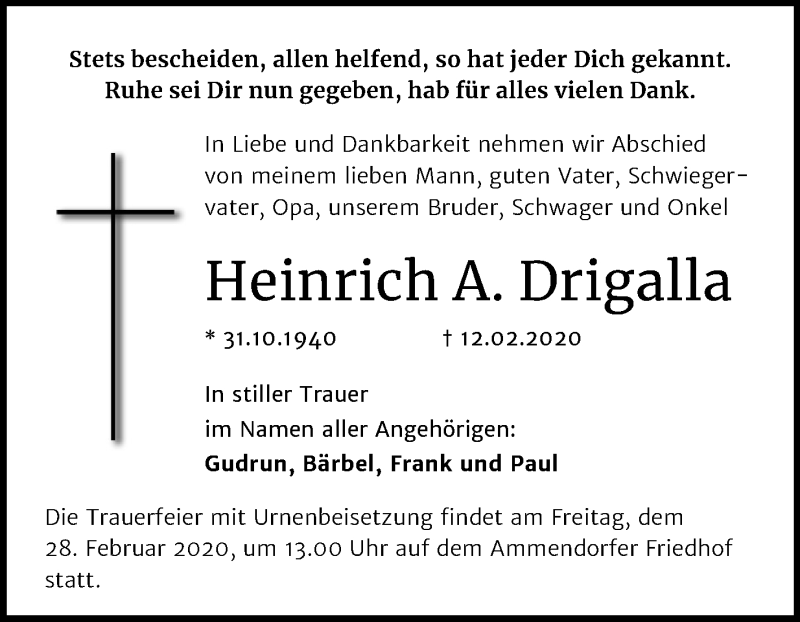 Hier finden Sie alle Traueranzeigen aus der Zeitung, die bisher für Heinrich A. Drigalla erschienen sind. Weitere Traueranzeigen, die in der Zeitung erscheinen, werden hier ebenfalls aufgelistet