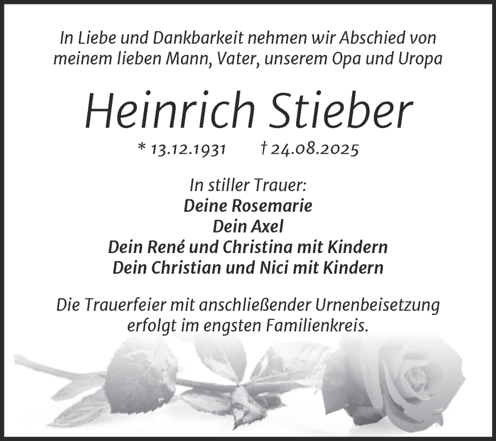Hier finden Sie alle Traueranzeigen aus der Zeitung, die bisher für Heinrich Stieber erschienen sind. Weitere Traueranzeigen, die in der Zeitung erscheinen, werden hier ebenfalls aufgelistet