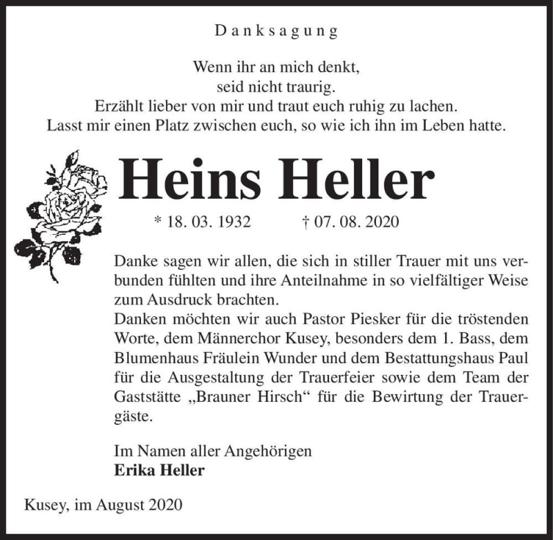 Hier finden Sie alle Traueranzeigen aus der Zeitung, die bisher für Heins Heller erschienen sind. Weitere Traueranzeigen, die in der Zeitung erscheinen, werden hier ebenfalls aufgelistet
