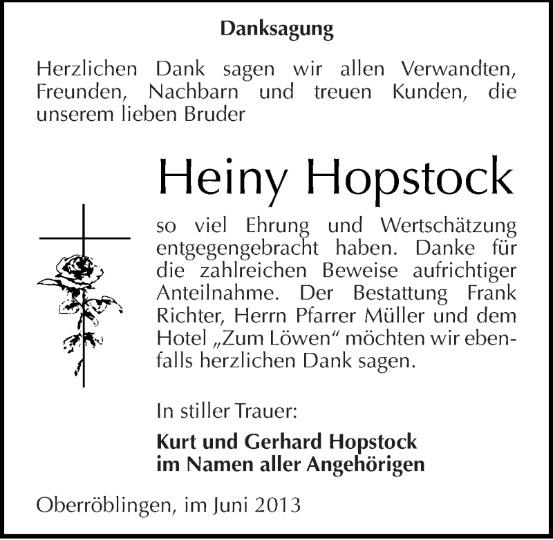 Hier finden Sie alle Traueranzeigen aus der Zeitung, die bisher für Heiny Hopstock erschienen sind. Weitere Traueranzeigen, die in der Zeitung erscheinen, werden hier ebenfalls aufgelistet