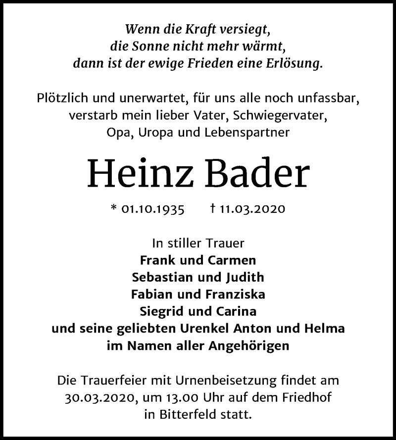 Hier finden Sie alle Traueranzeigen aus der Zeitung, die bisher für Heinz Bader erschienen sind. Weitere Traueranzeigen, die in der Zeitung erscheinen, werden hier ebenfalls aufgelistet