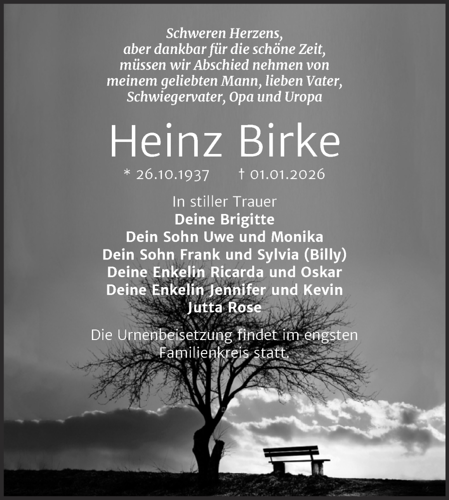 Hier finden Sie alle Traueranzeigen aus der Zeitung, die bisher für Heinz Birke erschienen sind. Weitere Traueranzeigen, die in der Zeitung erscheinen, werden hier ebenfalls aufgelistet