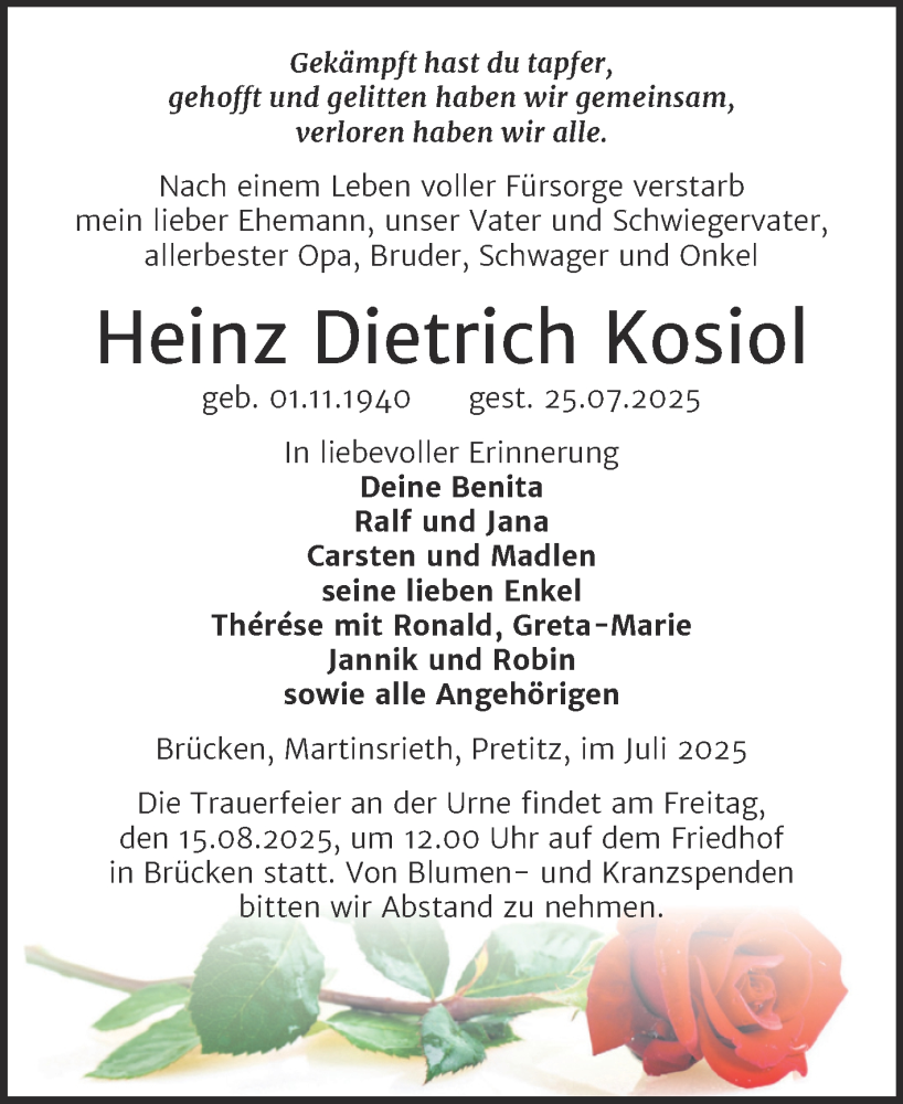 Hier finden Sie alle Traueranzeigen aus der Zeitung, die bisher für Heinz Dietrich Kosiol erschienen sind. Weitere Traueranzeigen, die in der Zeitung erscheinen, werden hier ebenfalls aufgelistet