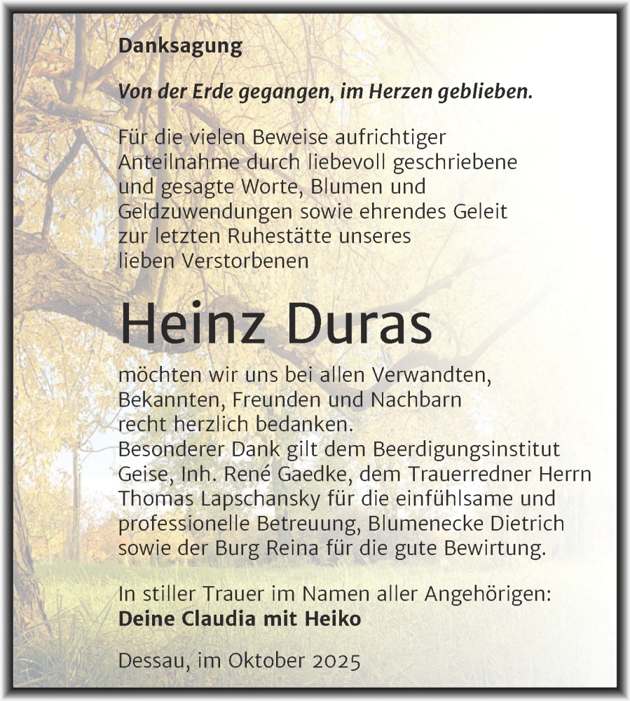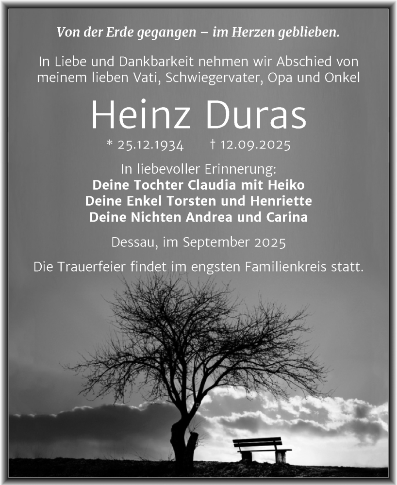 Hier finden Sie alle Traueranzeigen aus der Zeitung, die bisher für Heinz Duras erschienen sind. Weitere Traueranzeigen, die in der Zeitung erscheinen, werden hier ebenfalls aufgelistet
