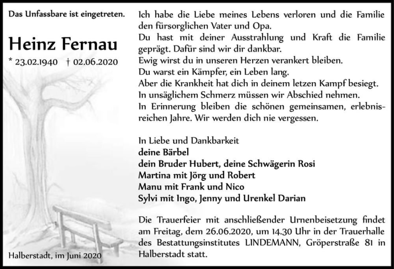 Hier finden Sie alle Traueranzeigen aus der Zeitung, die bisher für Heinz Fernau erschienen sind. Weitere Traueranzeigen, die in der Zeitung erscheinen, werden hier ebenfalls aufgelistet