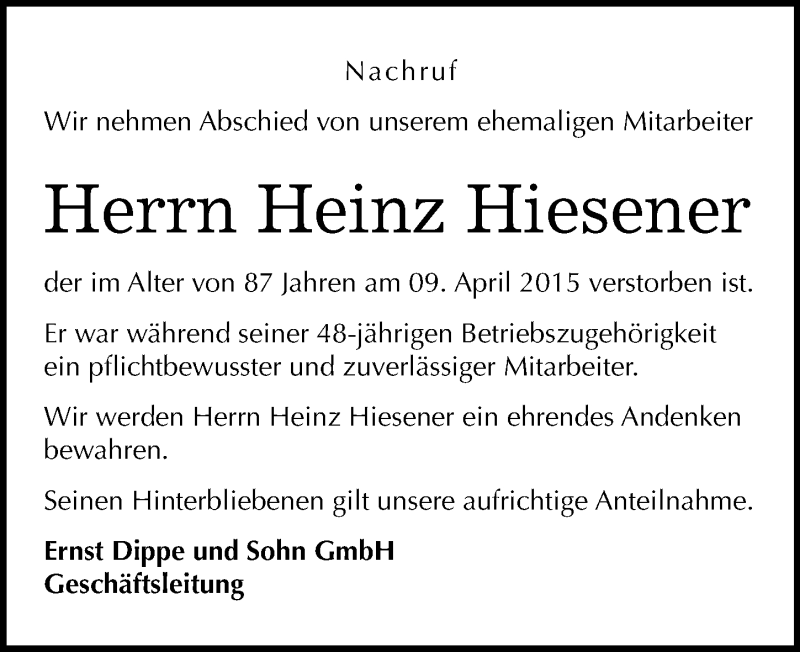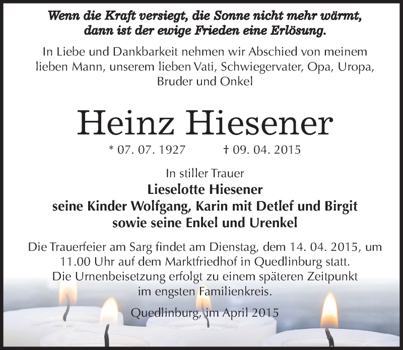 Hier finden Sie alle Traueranzeigen aus der Zeitung, die bisher für Heinz Hiesener erschienen sind. Weitere Traueranzeigen, die in der Zeitung erscheinen, werden hier ebenfalls aufgelistet