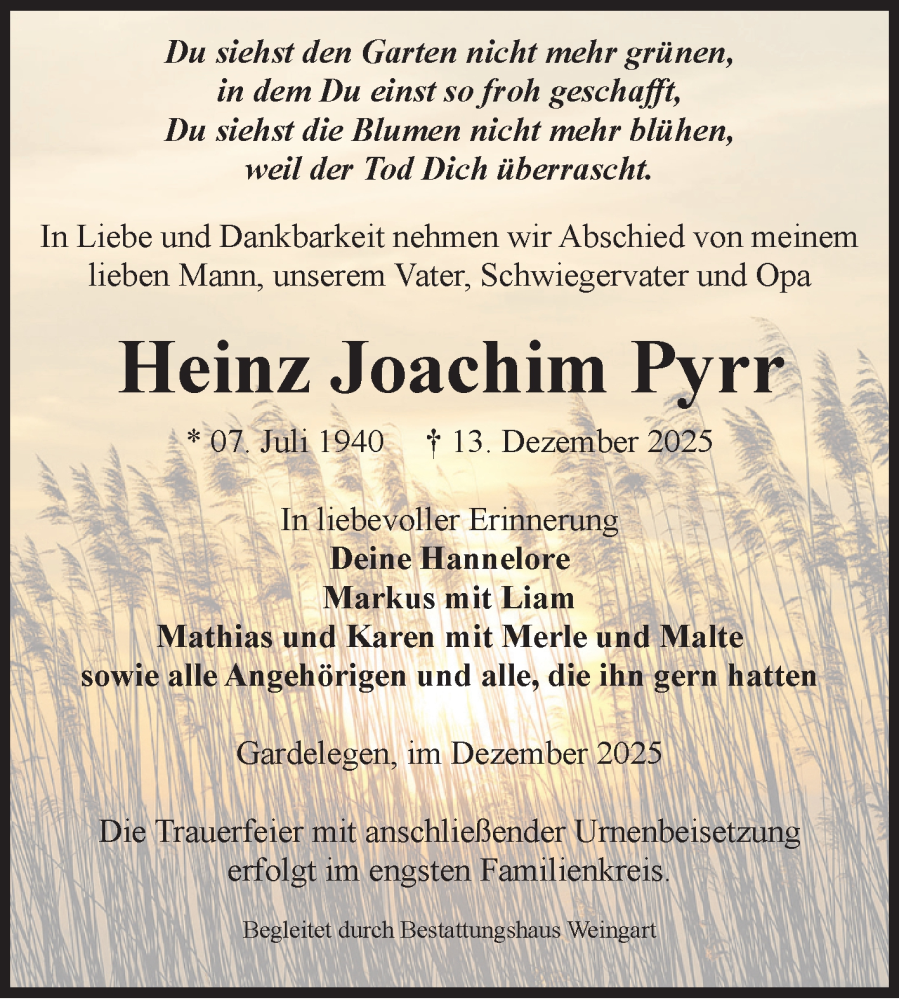 Hier finden Sie alle Traueranzeigen aus der Zeitung, die bisher für Heinz Joachim Pyrr erschienen sind. Weitere Traueranzeigen, die in der Zeitung erscheinen, werden hier ebenfalls aufgelistet