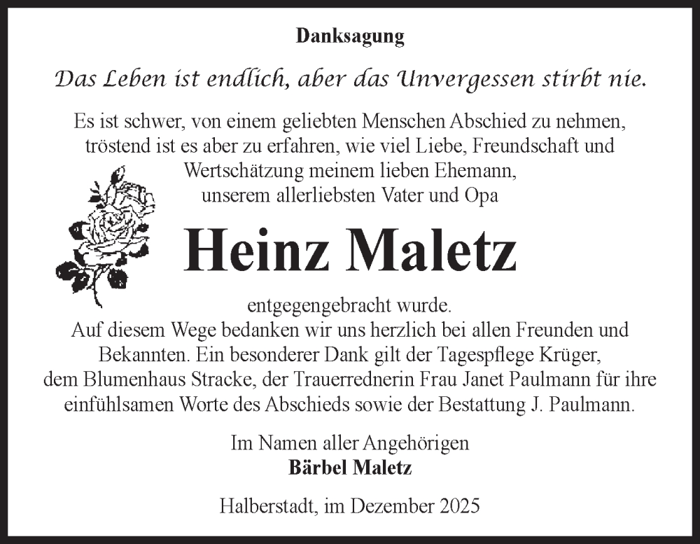 Hier finden Sie alle Traueranzeigen aus der Zeitung, die bisher für Heinz Maletz erschienen sind. Weitere Traueranzeigen, die in der Zeitung erscheinen, werden hier ebenfalls aufgelistet
